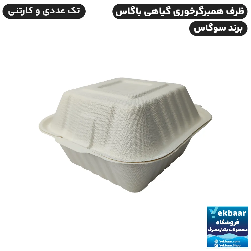 ظرف همبرگرخوری یکبار مصرف درب دار گیاهی باگاس – برند سوگاس | انتخاب حرفهای برای بستهبندی سالم، بادوام و استاندارد