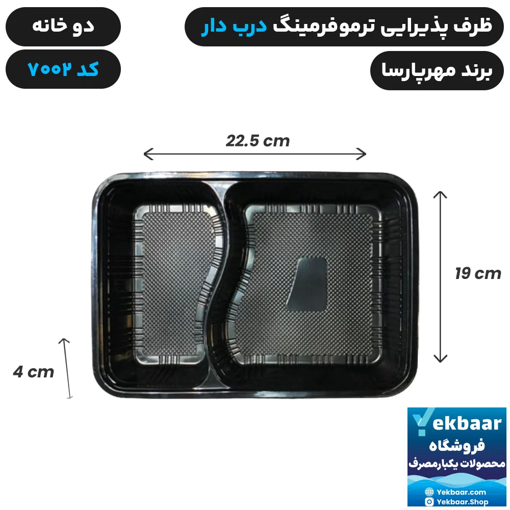 ظرف ترموفرمینگ دو خانه دو قسمتی کد 7002 دارای طول 29cm، عرض 19.5cm و ارتفاع 4.5cm می باشد.